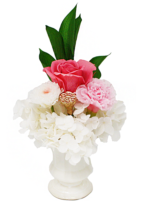 当社ではギフト用、季節行事、仏花等、幅広いラインナップで、国内の契約工場から供給されるプリザーブド加工とドライ加工の花材・葉材をディプロマ資格を持ったスタッフが当社保有の技術でアレンジメントを行い、国内の販売店へ出荷しております。