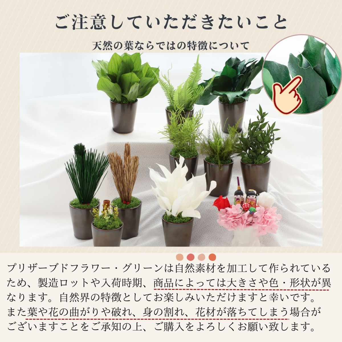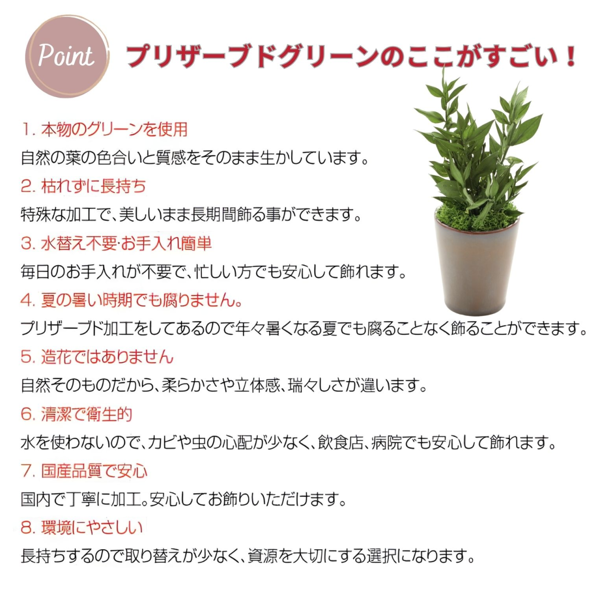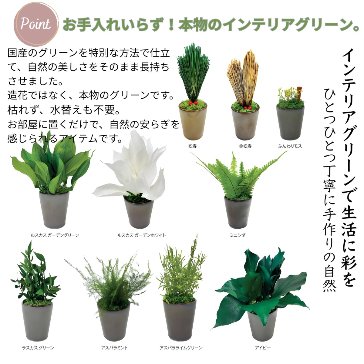 PRODUCT商品詳細 アスパラミントグリーン プリザーブド加工したアスパラの葉と苔を合わせてアレンジメントしました。 フレッシュなグリーンの葉が鮮やかで、明るく新鮮な雰囲気のアレンジメントです。 和風・洋風の場所を選ばず、どこに飾っても馴染むデザインです。 使用している植物はすべてプリザーブド加工を施しているので、水やりなどの手間は必要ありません。 日当たりが全くない場所でも枯れる心配はありません。場所や季節を選ばず、インテリアとして常に飾ることができます。