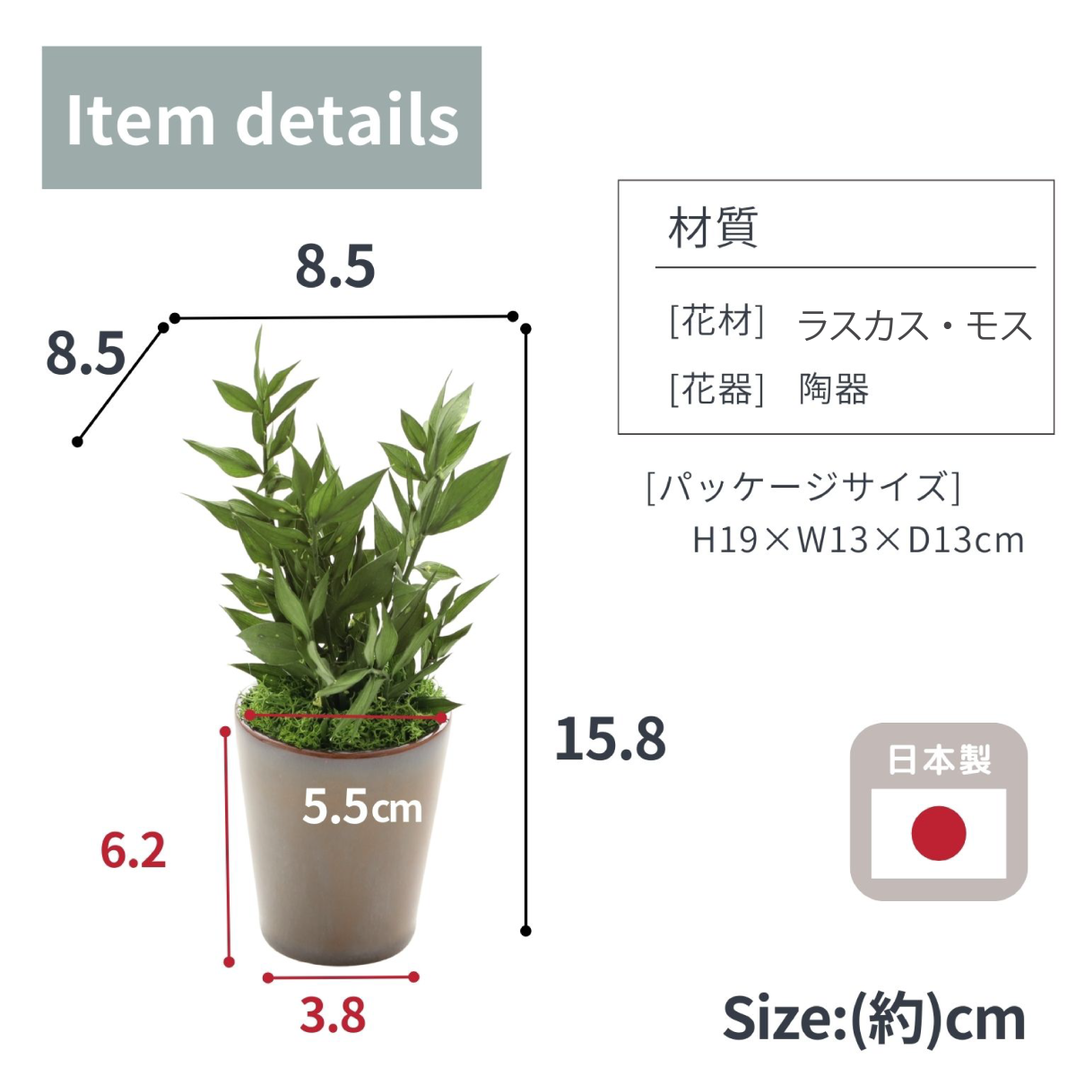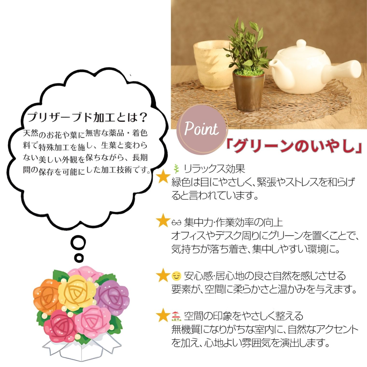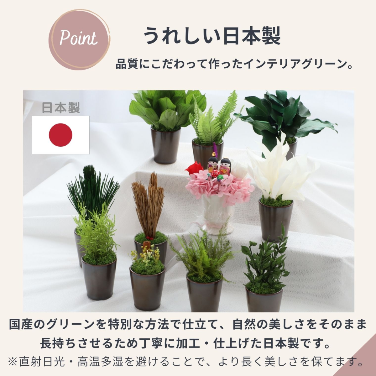 PRODUCT商品詳細 アスパラミントグリーン プリザーブド加工したアスパラの葉と苔を合わせてアレンジメントしました。 フレッシュなグリーンの葉が鮮やかで、明るく新鮮な雰囲気のアレンジメントです。 和風・洋風の場所を選ばず、どこに飾っても馴染むデザインです。 使用している植物はすべてプリザーブド加工を施しているので、水やりなどの手間は必要ありません。 日当たりが全くない場所でも枯れる心配はありません。場所や季節を選ばず、インテリアとして常に飾ることができます。