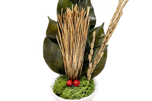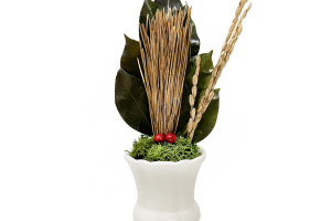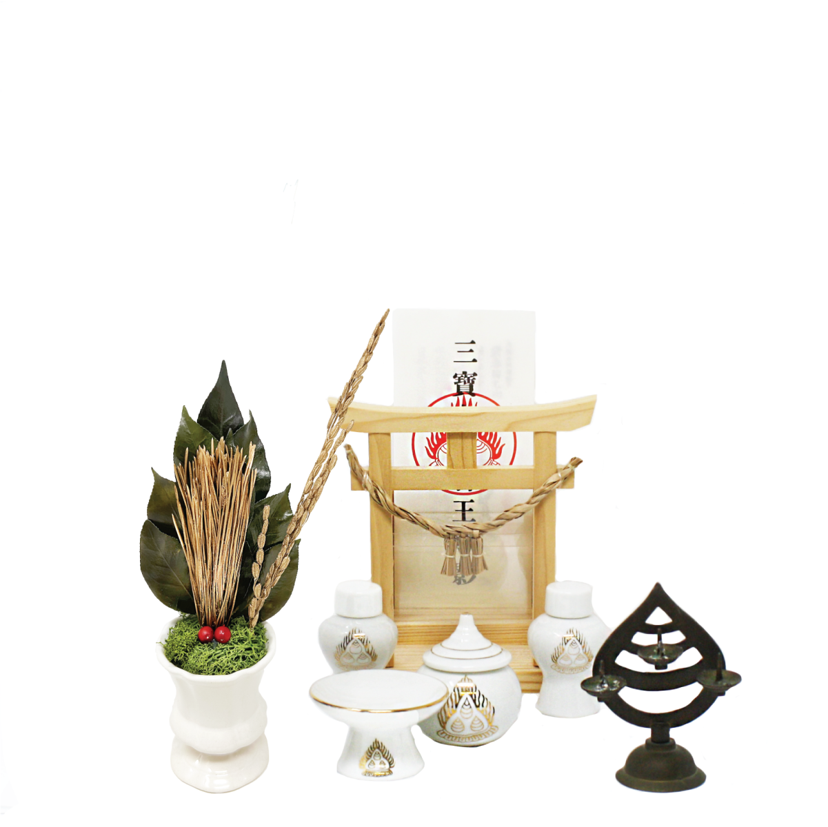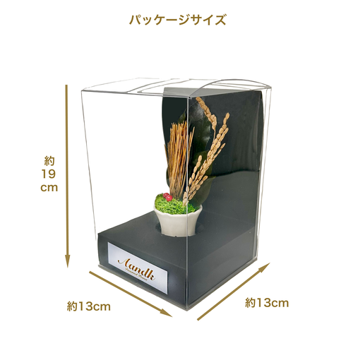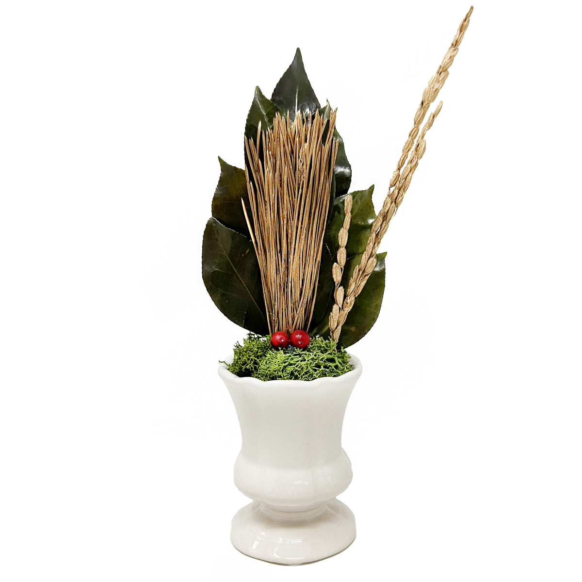 PRODUCT商品詳細 花器付き荒神松(金) 榊、金の松、南天の実、金の稲穂を使ったアレンジメントです. 神木であり「不老長寿」の象徴である松を金色にし、榊の緑に映える色合いになっています.南天は「難を転じて福となす」の意味合いで昔から縁起物として使われていました.金の稲穂は神聖さや豊かさを表し、お正月のお飾りなどに最適です. 花器付きなのでそのまま飾っていただけます.花器は陶器です.※自然素材でひとつひとつ手作りのため、大きさや多少の色味にムラがある場合があります.造花は一切使用しておりません.