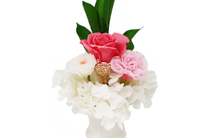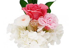 青々としたルスカス、ピンクローズをメインに桜色のカーネーション、花の中心がピンク色の小菊、金色のハスピックでアレンジし、周りを白い紫陽花で囲っています.